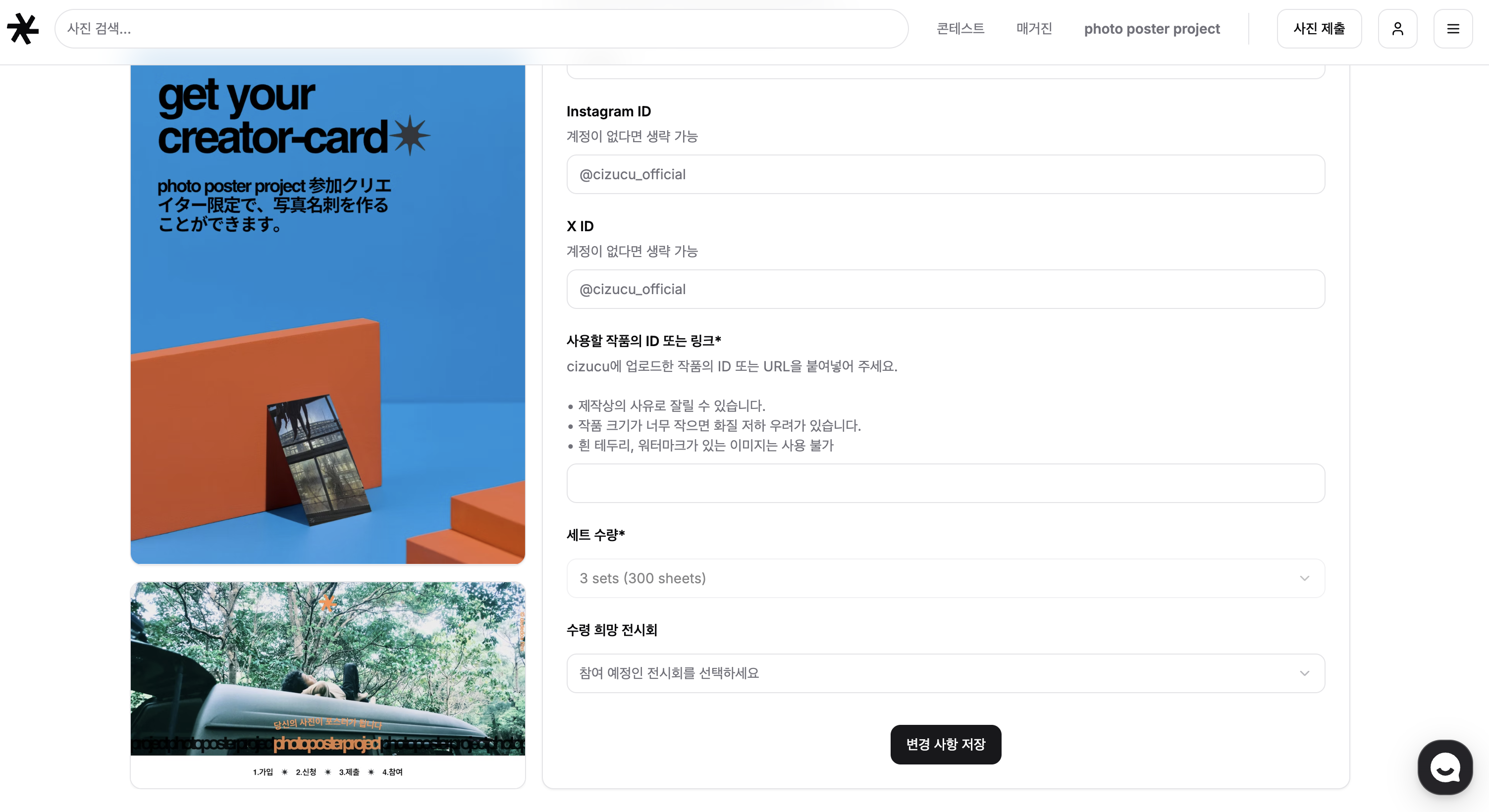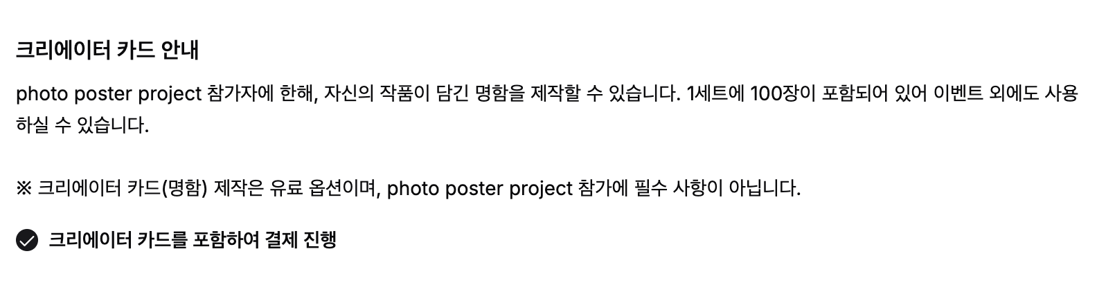 크리에이터 카드를 받기 위해서는 반드시 photo poster project에 참여해야 합니다.명함 제작 및 수령만을 위한 단독 주문은 현재 불가능합니다.
