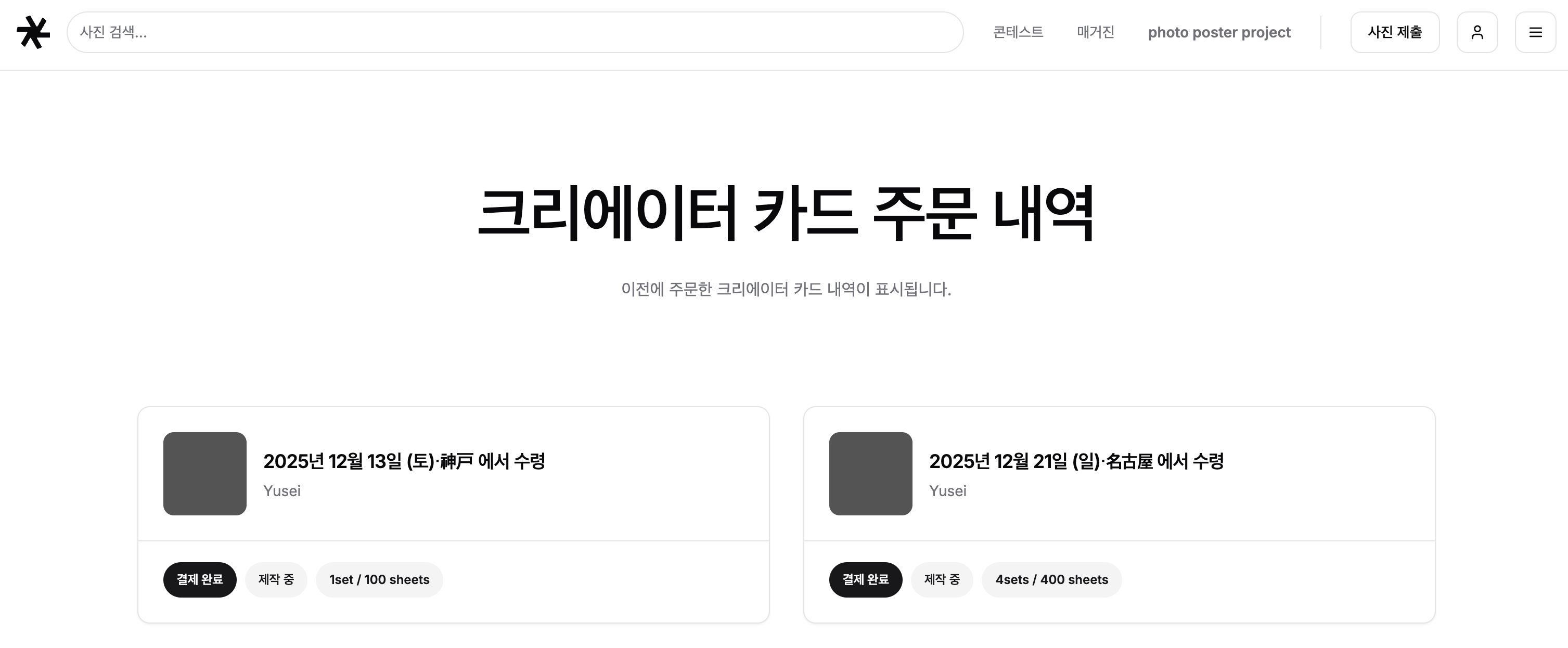 과거에 제작한 명함이나 현재 제작 중인 크리에이터 카드의 주문 정보를 확인할 수 있습니다.