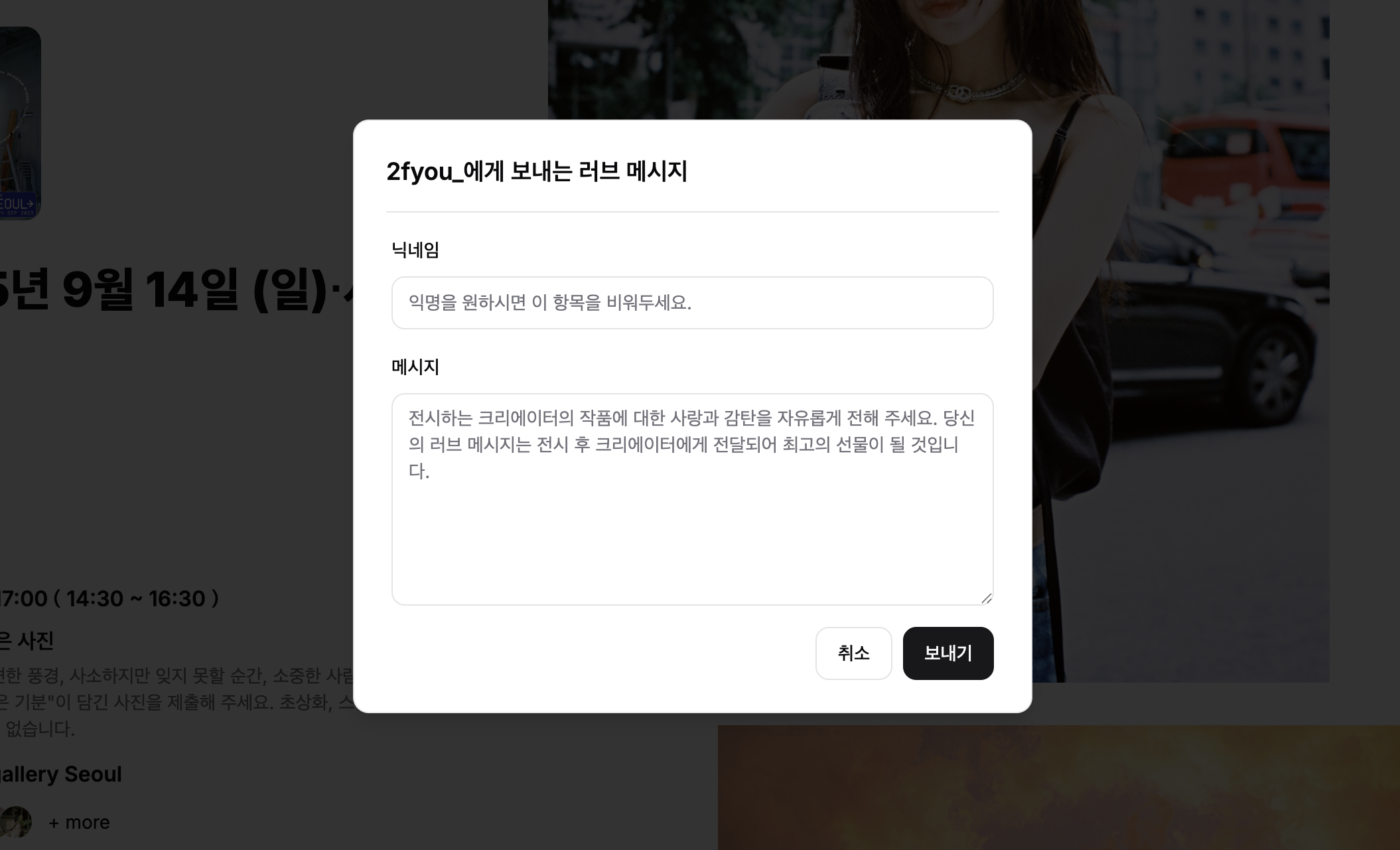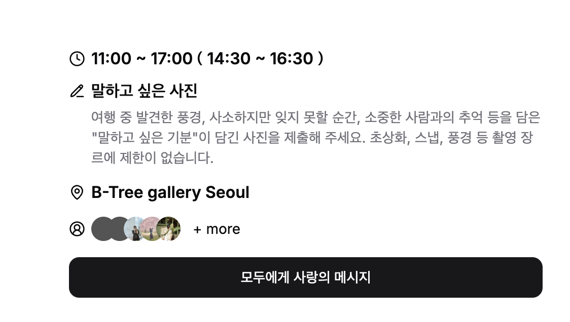 전시 작품 왼쪽 아래에 표시되는 ‘사랑의 메시지’ 버튼을 탭하거나 클릭합니다.